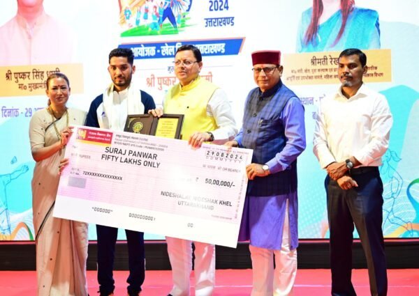 देहरादून : मुख्यमंत्री पुष्कर सिंह धामी ने गुरुवार को बहुउद्देशीय क्रीडा भवन, परेड ग्राउंड देहरादून में राष्ट्रीय खेल दिवस के अवसर पर आयोजित कार्यक्रम में सभी को खेल दिवस की शुभकामना दी तथा हॉकी के जादूगर के चित्र पर माल्यार्पण कर उन्हें श्रद्धांजलि अर्पित की। इस अवसर पर मुख्यमंत्री ने पेरिस ओलंपिक 2024 में प्रतिभाग करने वाले उत्तराखंड के 4 खिलाड़ियों ( लक्ष्य सेन, परमजीत सिंह, सूरज पंवार, अंकिता ध्यानी ) को 50 – 50 लाख की धनराशि के चेक प्रदान किये।